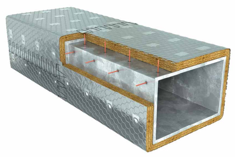 В основе огнезащиты дымоудаления используется вата из базальтовых волокон. Материал относится к категории НГ, что определяет его как негорючее вещество. Выдерживает температуру свыше 900 градусов по Цельсию. Монтаж огнезащиты позволяет препятствовать проникновению дыма в другие помещения, а также минимизирует распространение огня. К отличительным качествам относятся:
